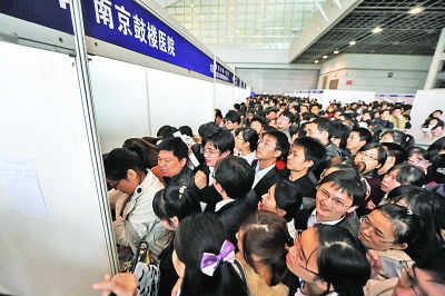 昨天,由(江蘇)省人才流動(dòng)服務(wù)中心、省衛(wèi)生人才交流服務(wù)中心、南京中醫(yī)藥大學(xué)共同舉辦的“江蘇省2012屆醫(yī)藥衛(wèi)生類畢業(yè)生人才交流大會(huì)”在南京國(guó)際展覽中心舉行。此次參會(huì)的300家單位,覆蓋省、市、縣(區(qū))、鄉(xiāng)(鎮(zhèn))各個(gè)層次,崗位需求總數(shù)首次突破萬(wàn)人,為歷年招聘會(huì)之最,本科以下學(xué)歷需求也有增多,吸引了2萬(wàn)多畢業(yè)生應(yīng)聘。