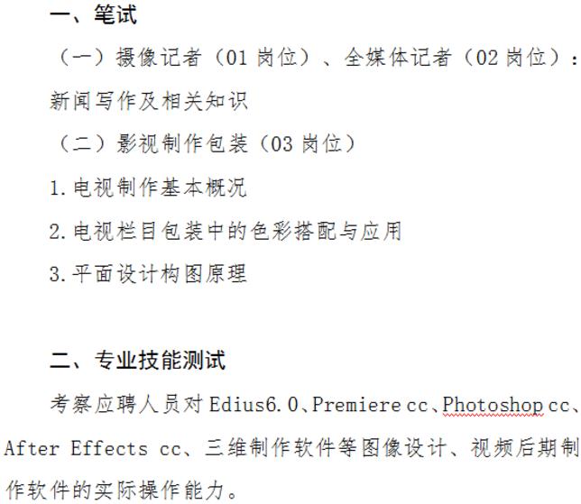攝像記者(01崗位)、全媒體記者(02崗位)考試方式為筆試和面試,影視制作包裝(03崗位)考試方式為筆試、面試和專業(yè)技能測試。