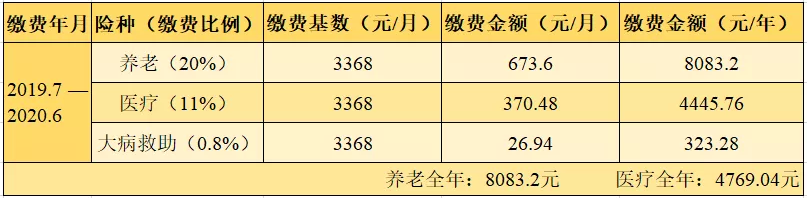 三、2019.7—2020.6年度最低繳費(fèi)標(biāo)準(zhǔn)(繳費(fèi)金額=繳費(fèi)基數(shù)×繳費(fèi)比例)
