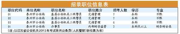 新泰州人才網(wǎng)訊: 泰州市公開招錄的22名人民警察,其中泰州市公安局招錄20名,職務為基層公安機關(guān)二級警員,均從事交通管理工作,要求報考者為男性,專業(yè)不限,此外,泰興市公安局招錄2名辦事員,從事內(nèi)部財務監(jiān)管工作,要求報考者的專業(yè)為財務財會類,須取得會計從業(yè)資格證書,且為中共黨員,崗位表見網(wǎng)頁下圖。 一、報名條件 報考人民警察,…